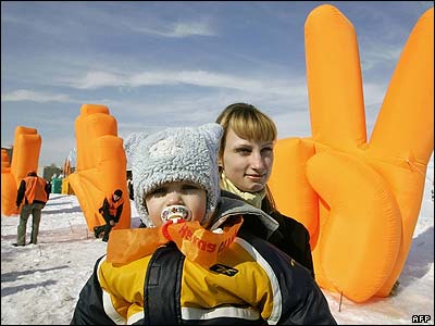 بچه ای که به همراه مادرش در جريان تبليغات ويکتور يوشنکو، رييس جمهور اوکراين، با عنوان "اوکراين ما". انتخابات پارلمانی اوکراين قرار است در ۲۶ ماه مارس برگزار گردد.