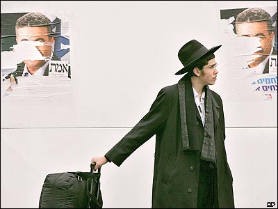 پشت سر مرد يهودی ارتدکس که در شهر بيت المقدس منتظر اتوبوس است، دو پوستر پاره شده از چهره امير پرتز، رهبر حزب کارگر اسرائيل ديده می شود. انتخابات پارلمانی در اسرائيل قرار است روز ۲۸ ماه مارس برگزار گردد.