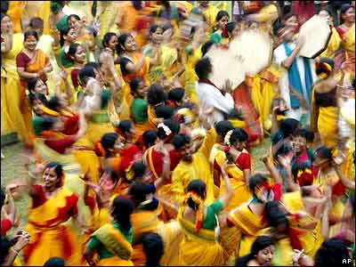 گروهی از دانشجويان و دبيران دانشگاه شهر کلکته در هند جشنواره بهاری را با موسيقی و رقص برگزار می کنند.