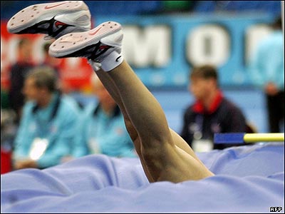 فرود يک ورزشکار پس از پرش بلند در جريان يازدهمين مسابقات انجمن بين المللی فدراسيون ورزشی در مسکو.