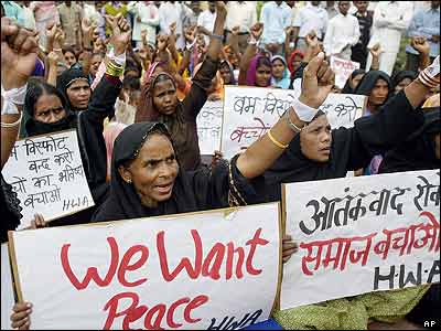 گروهی از زنان مسلمان و هندو مذهب هند که در اعتراض به بمب گذاری های روز سه شنبه در بنارس دست به راهپیمایی زده اند. اين بمبگذاری ها که یک معبد و یک ایستگاه راه آهن را هدف قرار داد، دویست کشته بر جای گذاشت.