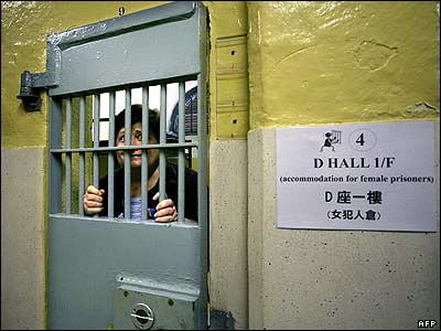 بازديدکننده ای که در ایام بازديد عمومی به زندان ویکتوریا هنگ کنگ آمده است.
