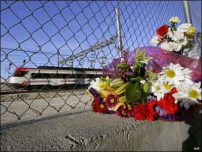 عبور یک قطار مسافربری از کنار حلقه گلی که درمحل وقوع انفجارهای مادريد روی زمين گذاشته شده است. بمبگذاری های مادريد در سال 2004 به کشته شدن 191 نفر و مجروح شدن بیش از هزار نفر دیگر منجر شد.