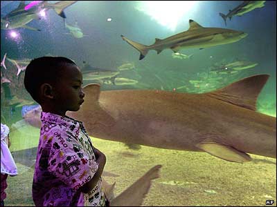 یک پسر بچه اندونیزیایی در تماشای کوسه ماهی هايی که در نمایشگاه جانوران و گیاهان در جاکارتا به نمایش گذاشته شده است. |