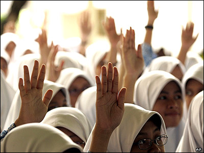دانش آموزان اندونزيايی در حال پرسيدن سوال از تونی بلر نخست وزير بريتانيا، تونی بلر برای يک سفر رسمی به اندونزی رفته است.