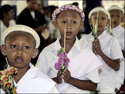 دانش آموزان جوان تايلندی در مراسمی مذهبی در يکی از معابد بودايی که در قسمت مسلمان نشين شهر ناراتيوات قرار دارد، شرکت کردند.