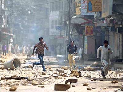 در دومين روز خشونت ها در پاکستان نيروهای پليس پاکستانی تظاهر کننده ای را خيابان به خيابان تعقيب می کنند. دهها هزار مسلمان سنی مذهب پس از انفجار ديروز در خيابانهای شهر راه افتادند و شهربانی را متهم کردند که امنيت کافی فراهم نکرده است