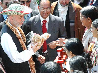 حامد کرزی در حيدرآباد هند هنگام ديدار از يک مرکز توسعه کشاورزی در روستاهای هند