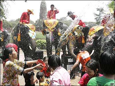 فيلی در حال آب پاشيدن به سر و روی کودکان تایلندی در فستيوال سه روزه سال نو که در تاريخ 13 آوريل در تايلند برگزار می شود.