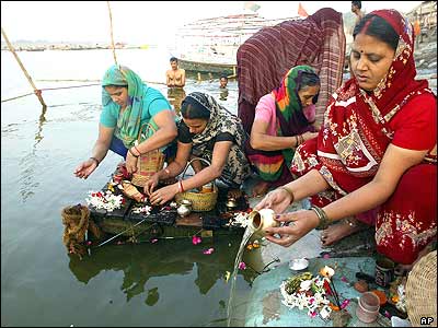 زائرين هندو هنگام دعا در نقطه اتصال رودخانه های گنگ و سند که يکی از مکان های مقدس هندوها در هند به شمار می رود