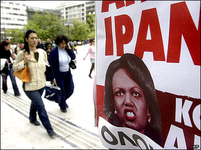 زن جوانی در آتن از کناری پوستری رد می شود که بر آن نوشته شده: 'دستها از ايران کوتاه'. اين پوستر را تظاهر کنندگان به سفر کاندوليزا رايس به يونان، حمل می کنند