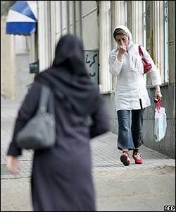 زنان ايرانی در خيابان های تهران. در تهران گفته شده که با زنان و دخترانی که با شلوار کوتاه يا بدون جوراب در انظار عمومی ظاهر شوند، روسری کوتاه و باريک به سر کنند و مانتوی کوتاه و چسبان بپوشند، برخورد قاطع خواهد شد