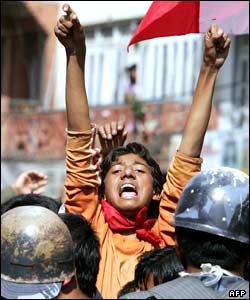 يک تظاهرکننده در حال شعار دادن عليه شاه گيانندرا در جريان راهپيمايی امروز طرفداران دموکراسی در کاتماندو، پايتخت نپال. در اثر تيراندازی نيروهای امنيتی حداقل سه تظاهر کننده کشته و بيش از چهل نفر مجروح شدند. |
