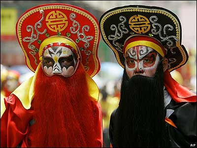 دو رقصنده در مراسم جشن سالروز تولد "تين هائو" در هنگ کنگ. به اعتقاد پيروان آيين تائو، "تين هائو" يا خدای دريا از ماهيگيران در دريا حفاظت می کند.