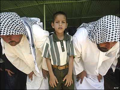 پسر جوانی به همراه والدينش در نماز جمعه شهر بصره. |