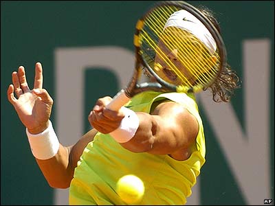 رافائل نادال، تنيس باز اسپانيايی در حال بازی با رقيبش گيلرمو کوريا از کشور آرژانتين در مرحله يک چهارم نهايی مسابقات تنيس موناکو.