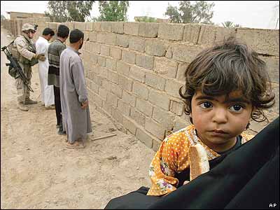 دختر کوچک عراقی بهمراه مادرش هنگاميکه ماموران آمريکايی در حال پرس و جوی ديگر افراد خانواده در غرب شهر بغداد هستند.
