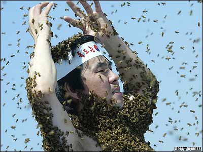 يک پرورش دهنده زنبور عسل اهل کره جنوبی سراسر بدنش پوشيده از دويست زنبور است. اين عمل او اعتراضی است به دولت ژاپن که ادعا کرده جزاير کوچک دوکدو متعلق به اين کشور است.