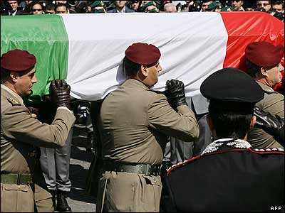 چند سرباز ايتاليايی در مراسم خاکسپاری قربانيان عمليات انتحاری در عراق. گفته می شود که سه تن از سربازان ايتاليايی و يک سرباز اهل رومانی در انفجار يک بمب در نزديکی قرارگاهشان در جنوب عراق کشته شده اند.