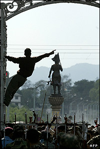 يکی از تظاهرکنندگان نپالی از در ساختمان پارلمان در شهر کاتماندو، پايتخت اين کشور بالا رفته. مخالفان دولت در اين تظاهرات با شعارهای تندی عليه گيريجا پراسات، نخست وزير، اعتراض خود را نشان دادند.
