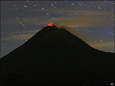 مواد مذاب در حال فوران از دهانه آتشفشان مراپی در جزيره جاوای اندونزی. دراثر آخرین فوران آتشفشان مراپی درسال 1994 میلادی ، 60 نفر جان خود را از دست دادند . |