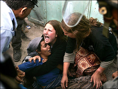 يک زن شهرک نشين اسرائيلی در هنگام برخورد با پليس اسرائيل در شهر الخلیل، در کرانه باختری رود اردن. بین ساکنان شهرکهای یهودی نشین و افسران پلیسی که آماده می شدند گروهی از شهرک نشینان را از یک خانه اشغالی فلسطینی، خارج کنند، درگیریهایی روی داده است. حداقل ده نفر دراین درگیری ها مجروح شدند.