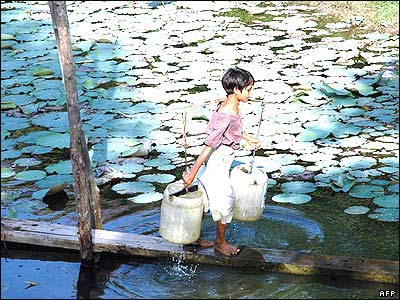دختر بچه ای در حال آوردن آب از درياچه ای پوشيده از گلهای نيلوفر آبی در حومه رانگون، پايتخت برمه. صندوق کودکان سازمان ملل متحد، يونيسف، با همکاری سازمان های غير دولتی در حال آماده کردن برنامه های آموزشی است که هدف آن جلوکيری از بيماری ايدز و آموزش مهارت های لازم برای امرار معاش به نوجوانانی است که در اين کشور آموزش رسمی نديده اند.