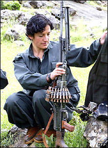 يک زن کرد پيش مرگه در دامنه کوههای قنديل در مرز ايران و عراق. يکی از فرماندهان گروههای مسلح کرد امروز تهديد کرد که نيروهايش حملاتی را عليه ايران انجام خواهند داد. وی گفت که ايران قصد دارد با هدف قرار دادن موضع آنها در داخل عراق، حمايت ترکيه را عليه آمريکا بدست آورد.