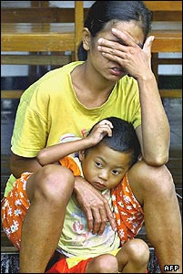 يک مادر اهل اندونزی جلوی اردوگاه آوارگان، پسرش را در دامان خود نگه داشته. در جريان فوران مواد مذاب کوه آتشفشان مراپی خيلی ها خانه هايشان را ترک کرده و به اردوگاه های مخصوص پناه بردند.