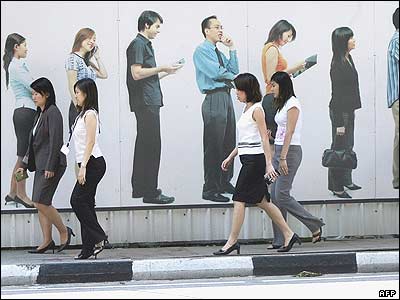 چند تن از کارکنان ادارات در يکی از خيابان های شهر سنگاپور از مقابل پوستر آگهی می گذرند. گفته می شود که رشد اقتصادی اين کشور، امسال از چهار درصد به شش درصد خواهد رسيد و اين به گفته لی هسين لانگ، نخست وزير سنگاپور، ناشی از افزايش توسعه محصولات سنگاپور است.