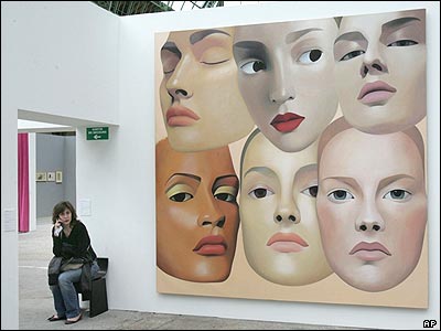 يکی از بازديدکنندگان نمايشگاه جديد "قدرت هنر" در موزه "گران پاله" پاريس در کنار تابلوی نقاشی هنرمند فرانسوی سيلوی فايفروسکا.