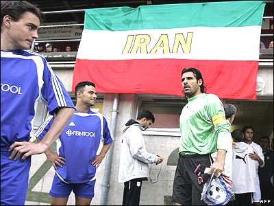 دو بازيکن باشگاه 'سوی ليس' و ابراهيم ميرزاپور دروازه بان تيم فوتبال ايران، قبل از يک مسابقه دوستانه در شهر برن در سوييس