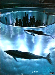 گروهی از بازديدکنندگان در مرکز نگهداری دلفين در شهر اوزاکای ژاپن.اين مرکز به شکل استوانه ای توخالی بنا شده تا بازديد کنندگان بتوانند دقيقا تجربه ديدن دولفين ها را از چشم کسانی که در اعماق آب شنا می کنند امتحان کنند. |