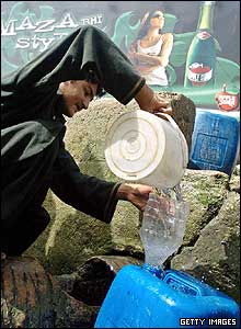 مرد پاکستانی در حال پر کردن ظرف پلا ستيكی از آب در کراچی. کمبود شدید آب در این منطقه از پاکستان حکمفرماست. گرمای شدید در پاکستان که به 50 درجه سانتی گراد رسيده است، دست کم جان 84 نفر را ظرف روزهای شنبه و يکشنبه گرفت.