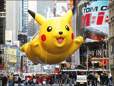 عروسک بادی بزرگ "پيکاچو" که قرار است در مراسم روز شکرگزاری استفاده شود، در ميدان تايمز نيويورک مورد آزمايش قرار می گيرد.