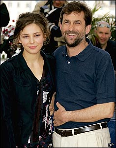 نانی مورتی، کارگردان معروف ايتاليايی بهمراه ياسمينه ترينکا، هنرپيشه ايتاليايی در جريان کنفرانس خبری برای فيلم جديدش با عنوان "Il Caimano" در فستيوال فيلم کن امسال.