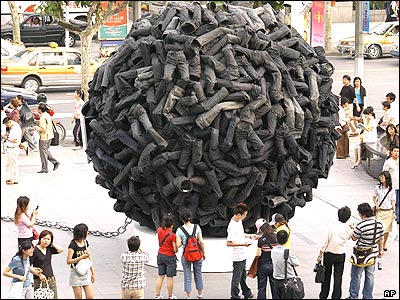 باز هم در چين: توپ ساخته شده از شلوار جين به بلندی 5 متر که در شانگهای به نمايش گذاشته شده توجه عابرين را به خود جلب کرد. |