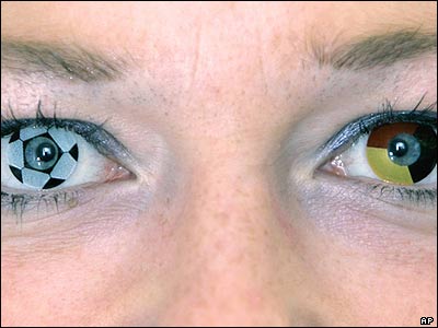 دختری آلمانی با لنزهای رنگی پرچم آلمان و ديگری طرح توپ فوتبال به مناسبت جام جهانی فوتبال که ماه آينده در آن کشور برگزار می شود