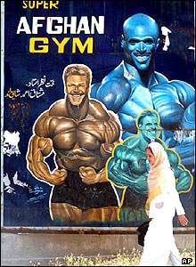 باشگاه بدن سازی "سوپر افغان": دختر افغان از مقابل تابلوی اين باشگاه در کابل می گذرد.