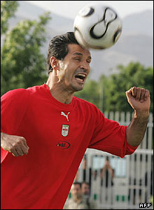 علی دايی بازيکن سرشناس تيم ملی فوتبال ايران در حال تمرين در تهران. تيم ملی ايران خود را برای حضور در مسابقات جام جهانی در آلمان آماده می کند. نخستين بازی ايران با تيم مکزيک خواهد بود.