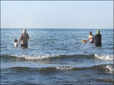 شنا کردن خانم ها با رعايت حجاب کامل اسلامی! با مانتو، روسری و پيرهن و شلوار!