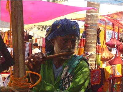 مرد فلوت زن، چهارشنبه بازار انجونا، گوا-هند