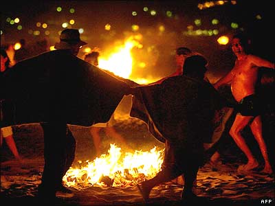 مردم در شمال شرق اسپانيا در مراسم بزرگداشت سن جان قديس. مردم در اين ناحيه اسپانيا عقيده دارند که با جهيدن از روی آتش می توانند خودشان را از گناه منزه کنند