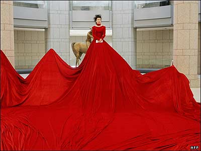 هنرمند ژاپنی و لباس قرمزش با ادامه 20 متريش در موزه هنر های يوکوهاما