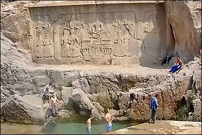 نقش برجسته فتحعلی شاه قاجار و شاهزادگان در پايين باروی باستانی ری و روی صخره سنگی چشمه علی. بچه ها از ايوان اين محل داخل آبگير چشمه شيرجه می روند.