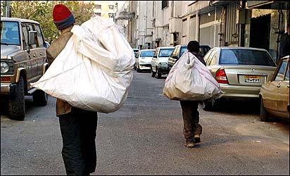 دو نوجوان آشغال جمع کن که در ميان آشغال ها به دنبال وسايل به درد بخور می گردند