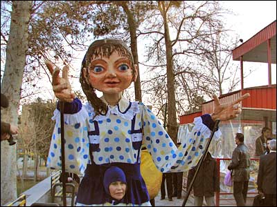 در اين نمايش عروسکهای بزرگ چهار متری با ساز و دهل ايرانی اطراف ساختمان تئاتر شهر برنامه اجرا میکنند.