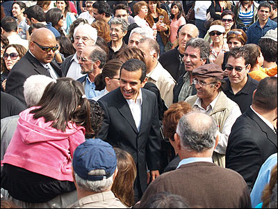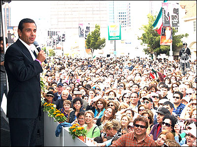 آنتونيو وياراگوسا شهردار لس آنجلس در ميان ايرانيان مجتمع در مراسم سال نو در حال دست دادن با مردم راه خود را به سوی جايگاه باز می کند.
