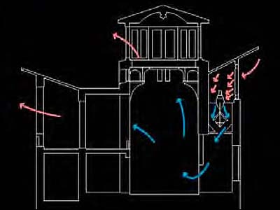سیستم خنک کننده این ساختمان از دو روش ساده تشکیل شده است. روش نخست کاملا شبیه بادگیرها در خانه های کویری است.