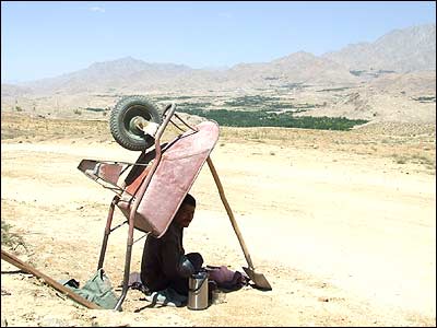 حبیب میرزایی: مردی در حال نوشیدن چای در زیر سایبانی که از اسباب کار وی ساخته شده است. تصویر شهرک سنگماشه در پشت سر وی دیده می شود.